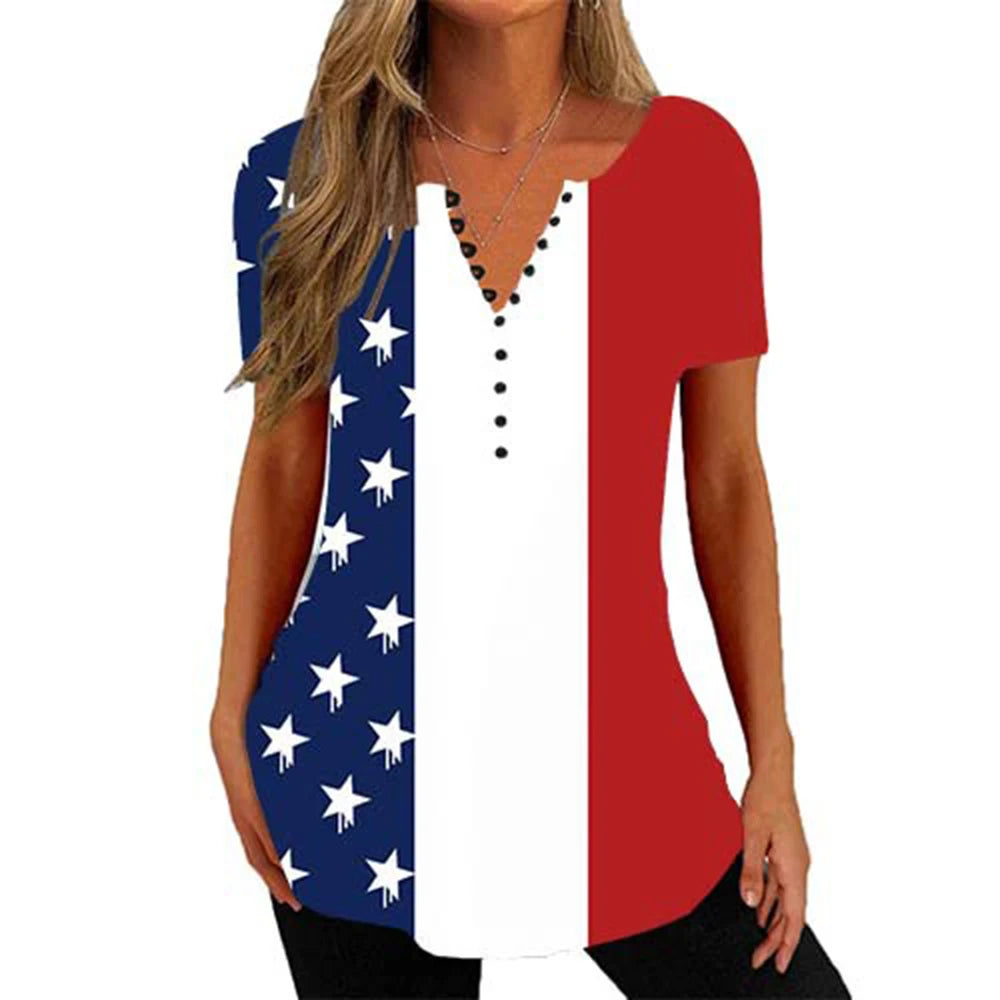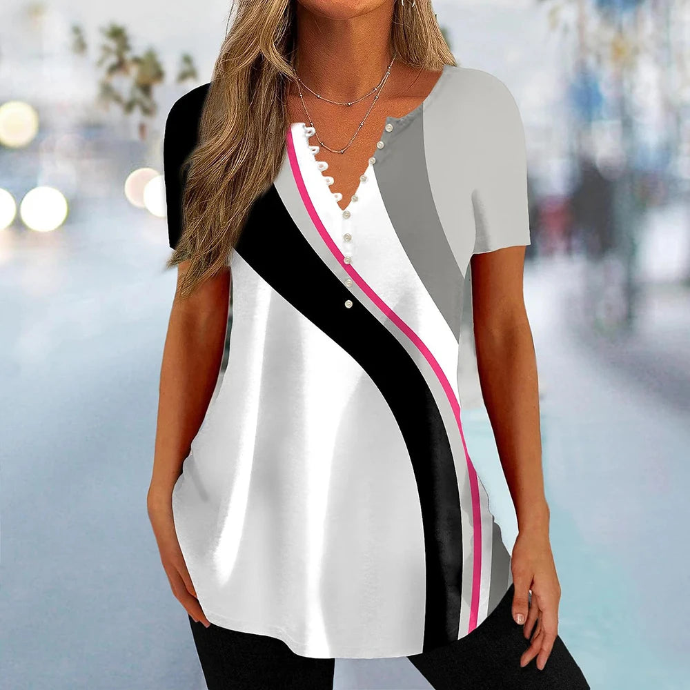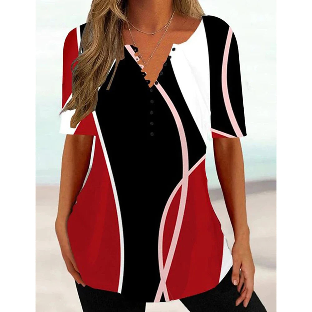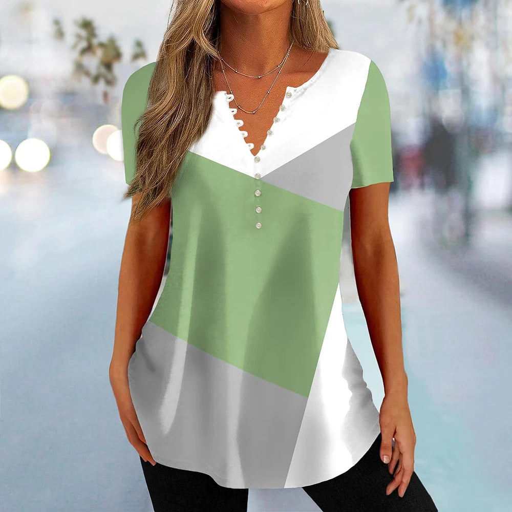 Women's New V-Neck Button-Down T-Shirt Summer Street Relaxed Plaid Shirt Fashion Casual Seven-Point Sleeve T-Shirt Top