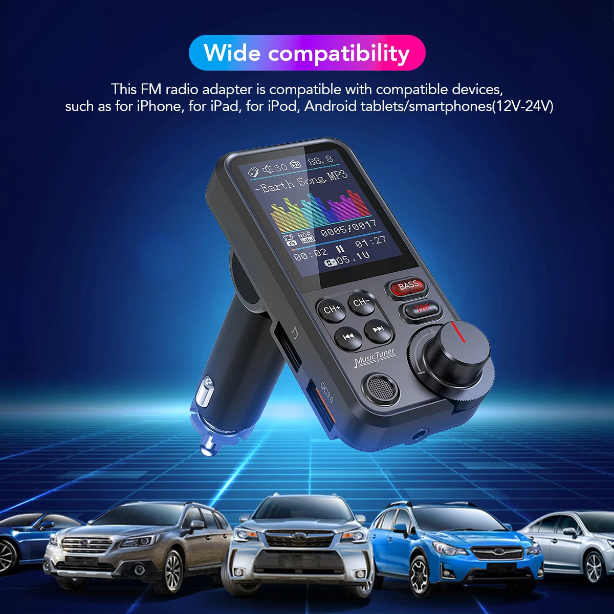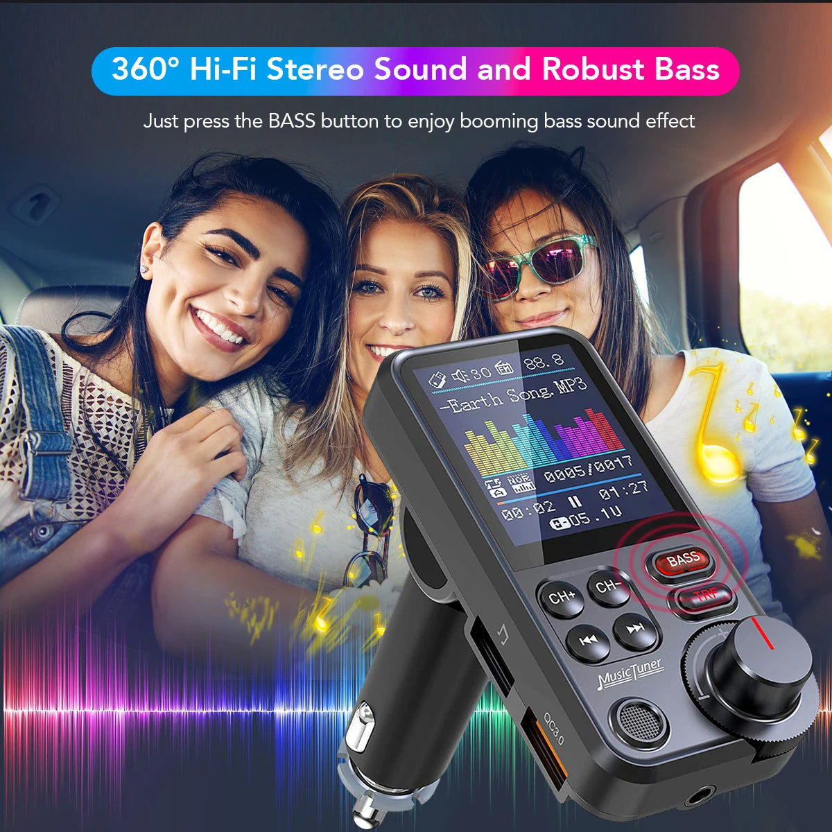 1.8 Inch Wireless Car Bluetooth FM Transmitter-Aux Supports QC3.0 Charging Treble and Bass Sound Music Player